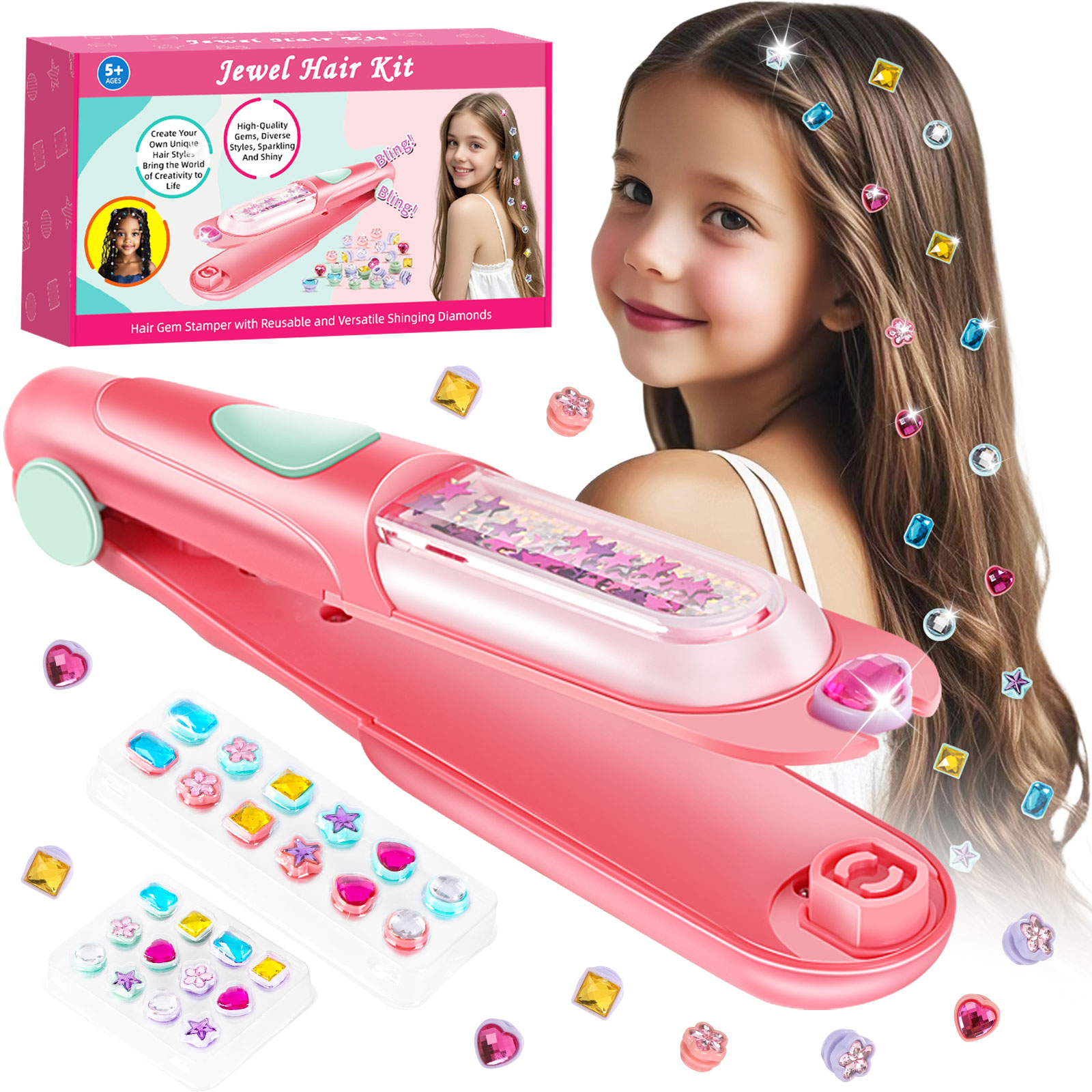Hair Gem Stamper Kit, Bling Hair Jewels for Girls Toys, Hair Styling Tool with Reusable Shining Diamonds, Birthday Gifts Toys for Girls Ages 3 4 5 6 8-12